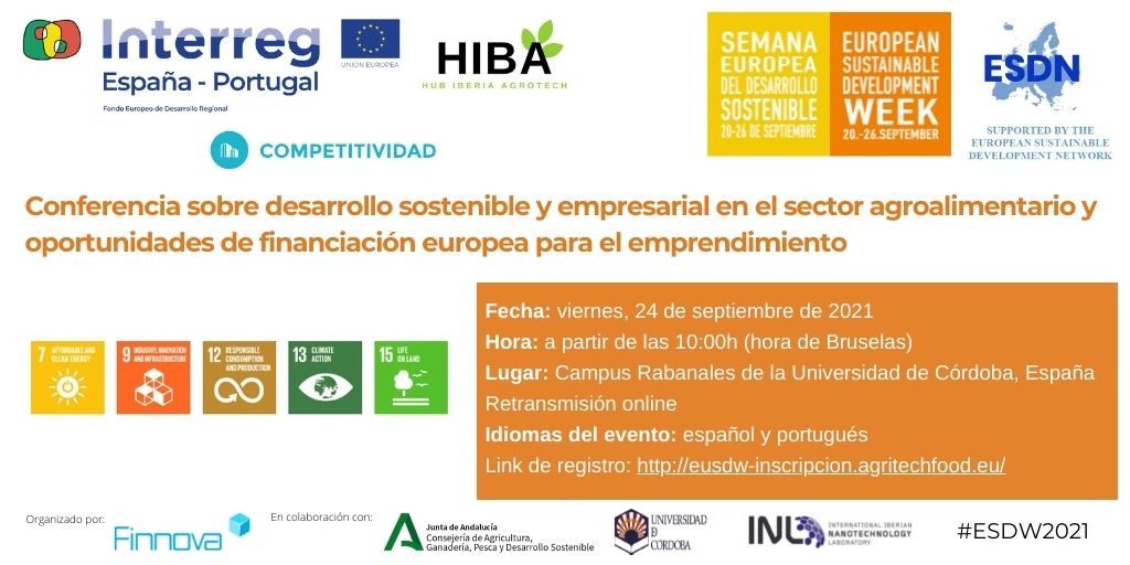Sevilla, XX de septiembre de 2021. El proyecto Interreg HIBA [Hub IBeria Agrotech: creación de un ecosistema Plurirregional para la Agrodigitalización a través de los Digital Innovation Hub (DIH)] celebra el próximo viernes 24 de septiembre de 2021, un evento organizado por la Fundación Finnova, como una de las entidades beneficiarias del proyecto. Se trata de una jornada que tratará sobre desarrollo sostenible y empresarial en el sector agroalimentario, en el marco de la Semana Europea de la Semana Europea del Desarrollo Sostenible (ESDW), la iniciativa europea para la promoción y visibilización de proyectos que promueven el desarrollo sostenible y los ODS. El evento será presencial en el Campus Rabanales de la Universidad de Córdoba y también se retransmitirá en directo online. El evento, que tendrá lugar a partir de las 10:30h (hora de Bruselas) en la ciudad andaluza de Córdoba y se retransmitirá a través plataformas de streaming, se titula “Conferencia sobre desarrollo sostenible y empresarial en el sector agroalimentario. Oportunidades de financiación europea para el emprendimiento”. Esta jornada pretende no sólo ahondar en las distintas fuentes de financiación europeas aplicables al sector Smart Agri-food, sino que quiere abordar las herramientas y estrategias que pueden favorecer e impulsar a los ecosistemas locales y plurirregionales de emprendimiento. Para ello, se contará con la participación de representantes del sector agroalimentario, así como de expertos en materia de fondos y programas europeos, siendo los idiomas oficiales del evento el español y el portugués. Regístrate en el evento en http://eusdw-inscripcion.agritechfood.eu/ Consulta la agenda provisional AQUÍ. El sector Smart Agri-food está más en boga que nunca, es por ello por lo que nació el proyecto Interreg HIBA, un proyecto que persigue, desde un punto de vista plurirregional, el desarrollo sostenible y el impulso de los ecosistemas de innovación digital agroalimentarios. HIBA busca mejorar la capacidad y sostenibilidad empresarial, así como dar un impulso a la creación de nuevas empresas, pymes y start-ups, siempre a través de la digitalización y de la cooperación transfronteriza. Por último, hay que destacar que esta jornada es un evento paralelo de la Semana Europea del Desarrollo Sostenible, una iniciativa de la Comisión Europea para facilitar la organización de actividades que promuevan el desarrollo sostenible, que tendrá lugar entre los días 20 y 26 de septiembre. El proyecto HIBA está en consonancia con los Objetivos de Desarrollo Sostenible número 7 (energía asequible y no contaminante), 9 (industria, innovación e infraestructuras), 12 (producción y consumo responsables), 13 (acción por el clima) y 15 (vida de ecosistemas terrestres). Sobre Interreg HIBA El proyecto HIBA [Hub IBeria Agrotech: creación de un ecosistema Plurirregional para la Agrodigitalización a través de los Digital Innovation Hub (DIH)], cuenta con un presupuesto total de 5,3 millones de euros, cofinanciado (75%) por el Fondo Europeo de Desarrollo Regional FEDER en el marco del programa Interreg V A España – Portugal (POCTEP) 2014-2020. Compuesto por 19 socios de España y Portugal, HIBA se centra en Impulsar un ecosistema Plurirregional en Agrodigitalización a partir de la creación de una Red de Digital Innovation Hubs (DIHs ) que fomente la iniciativa, competitividad y sostenibilidad empresarial, propiciando la reactivación económica post -Covid19. La Red de iberia facilitará y/o detonar á la Digitalización, centrándose en el despliegue y oferta de servicios tecnológicos, en el desarrollo de itinerarios formativos y de emprendimiento para distintos niveles de usuarios y necesidades empresariales, en la creación de entornos de experimentación de tecnologías innovadoras para su adaptación y adopción en el entorno empresarial, así como en la dinamización de espacios de diálogo y co -creación para compartir prioridades y líneas de trabajo. El proyecto HIBA ha sido diseñado con un enfoque integrado, de manera que sea coherente con el marco político de la UE, en particular con las estrategias y políticas con incidencia Plurirregional del territorio POCTEP. Duración del proyecto: 01/07/2018 – 31/12/2022. Sobre la Fundación Finnova www.finnova.eu Finnova es una fundación que trabaja para la promoción y el desarrollo de la innovación y el espíritu empresarial a nivel de la UE. Con sede en Bruselas, opera a través de colaboraciones y asociaciones en todos los países de la Unión Europea. La experiencia de Finnova liderando actividades de comunicación y difusión de proyectos europeos se combina con una sólida experiencia probada en la creación de empresas y programas de apoyo empresarial, como aceleradoras, incubadoras y selección y adjudicación de eventos ceremoniales. Sobre la Semana Europea del Desarrollo Sostenible (European Sustainable Development Week) https://esdw.eu/ ESDW es una semana europea cuyo fin es el de facilitar la organización de actividades que giren en torno a la celebración de actividades que promuevan el desarrollo sostenible, facilitando la creación de sinergias a través de un espacio común. Este 2021 tendrá su semana principal entre los días 20 y 26 de septiembre, aunque se posibilita la opción de celebrar eventos paralelos desde el 18 de septiembre hasta el 8 de octubre. ESDW tiene un fuerte compromiso con la Agenda 2030 y sus 17 Objetivos de Desarrollo Sostenible (ODS), por lo que todas las actividades y eventos que tengan lugar durante estas fechas deberán tener un vínculo temático con estos ODS.