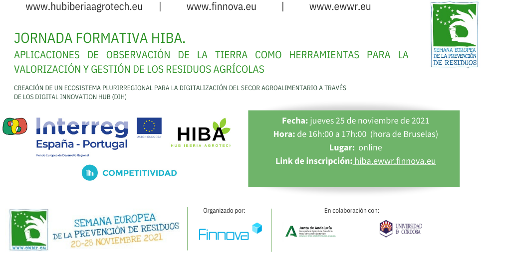 La jornada tendrá lugar el jueves 25 de noviembre de 2021 de 16.00 horas a 17.00 horas (CET) en formato online Durante el evento, se darán a conocer las posibilidades de cuantificación, valorización y gestión de los residuos agrícolas con herramientas de procesado de imágenes de satélite de libre acceso La jornada formativa forma parte de las acciones del proyecto Interreg HIBA para el desarrollo de las capacidades formativas y de los entornos de experimentación para la innovación digital empresarial. Sevilla, 23.11.2021 – El próximo jueves 25 de noviembre de 2021, de 16.00 horas a 17.00 horas (CET), se celebraráel evento online “Jornada formativa HIBA: aplicaciones de observación de la Tierra como herramientas para la valorización y gestión de los residuos agrícolas”. Organizado por la Fundación Finnova, en colaboración con la Universidad de Córdoba, en el marco de la Semana Europea de la Prevención de Residuos, se expondrán las fuentes de financiación europeas para la promoción de la innovación y su forma de acceso para empresas y emprendedores. Durante el evento, cuya inscripción se puede hacer desde aquí́, se conocerán además las posibilidades de cuantificación, valorización y gestión de los residuos agrícolas con herramientas de procesado de imágenes de satélite de libre acceso. David Vinué y Carolina Lechado, técnicos de proyectos europeos de la Fundación Finnova y, Francisco Javier Mesas, profesor del Departamento de Ingeniería Gráfica y Geomática de la Universidad de Córdoba serán los ponentes de esta jornada formativa que forma parte de las acciones del proyecto Interreg HIBA para el desarrollo de las capacidades formativas y de los entornos de experimentación para la innovación digital empresarial. David Vinué expondrá las capacidades y potencialidades de las técnicas de observación de la tierra para la agrodigitalización y fuentes de financiación. Por su parte, Carolina Lechado hablará de las oportunidades financieras para la agrodigitalización en el espacio de cooperación transfronteriza POCTEP. Por último, Francisco Javier Mesas abordará la monitorización mediante datos UAV hiperespectral de contenido de nitrógeno y nitratos en la planta. Sobre el Proyecto HUB IBERIA AGROTECH (HIBA): (hubiberiaagrotech.eu) El Proyecto HUB IBERIA AGROTECH (HIBA): creación de un ecosistema plurirregional para la agrodigitalización a través de los Digital Innovation Hub (DIH), está cofinanciado en un 75% por el Fondo Europeo de Desarrollo Regional (FEDER), en el marco del programa Interreg V A España – Portugal (POCTEP) 2014-2020. El proyecto impulsará un ecosistema Plurirregional centrado en la digitalización del sector agroalimentario de España y Portugal a partir de la creación de una red de Digital Innovation Hubs (DIH) que fomente la iniciativa, la competitividad y la sostenibilidad empresarial, propiciando la reactivación económica post-Covid19. Con un presupuesto de 5,3 millones de euros, HIBA cuenta con 19 socios beneficiarios liderados por la Consejería de Agricultura, Ganadería, Pesca y Desarrollo Sostenible de la Junta de Andalucía, a través de Andalucía Agrotech DIH. La Red facilitará y estará centrada en: el despliegue y oferta de servicios tecnológicos el desarrollo de itinerarios formativos y de emprendimiento para distintos niveles de usuarios y necesidades empresariales la creación de entornos de experimentación de tecnologías innovadoras para su adaptación y adopción en el entorno empresarial la dinamización de espacios de diálogo y co-creación para compartir prioridades y líneas de trabajo Sobre la Fundación Finnova (www.finnova.eu) Fundación europea para la financiación de la innovación. Es una fundación europea con sede en Bruselas y España, cuyos objetivos son promover la cooperación público-privada mediante la innovación para abordar retos sociales como el empleo, la formación, el emprendimiento, los ODS de Naciones Unidas, la economía circular, etc. Finnova organiza los Startup Europe Awards, una iniciativa de la Comisión Europea y la Fundación Finnova, para reconocer a las mejores startups europeas en el ámbito social.