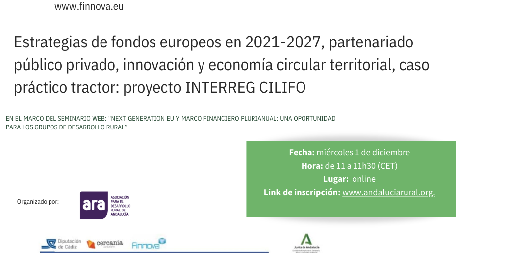 El próximo miércoles 1 de diciembre, de 11h00 a 11h30 (CET), el CEO de Finnova Juan Manuel Revuelta presentará casos prácticos de partenariado público privado, como el proyecto Interreg Ciifo o Interreg HIBA en el marco del Seminario Web “Next Generation EU y Marco Financiero plurianual: una oportunidad para los grupos de desarrollo rural” organizado por ARA (Asociación para el Desarrollo Rural de Andalucía),Bajo el título “Estrategias de Fondos Europeos en 2021-2027, partenariado público-privado, innovación y economía circular territorial, caso práctico tractor: proyecto INTRERREG CILIFO, Revuelta explicará las posibilidades de financiación de los territorios rurales de España y Portugal.El proyecto CILIFO (Centro Ibérico para la Investigación y Lucha contra los Incendios Forestales) está financiado por el Programa de Cooperación Transfronteriza Interreg VA España – Portugal – POCTEP (2014-2020). Con un presupuesto total de 24,6 millones de euros, de los cuales el 75% está financiado por el Programa de Cooperación Transfronteriza Interreg VA España-Portugal – Interreg POCTEP (2014-2020), CILIFO trabaja en una buena gestión de los residuos forestales y su valorización que ayuden a buscar soluciones innovadoras basadas en la economía circular que fomenten la adaptación y mitigación del cambio climático. Recientemente, la Comisión Europea en asociación con el Comité de las Regiones ha concedido al proyecto CILIFO, liderado por la Junta de Andalucía, gracias al coorganizador Fundación Finnova, el premio europeo en la categoría 4: “Apoyo a la internacionalización de las empresas.” Gracias al partenariado público privado de innovación abierta liderado por la Junta de Andalucía, Consejería de Agricultura, Ganadería, Pesca y Desarrollo Sostenible se ha conseguido implementar la primera aceleradora/incubadora a nivel mundial enfocada en incendios forestales, denominada Firefighting Open Innovation Lab – CILIFO. Revuelta también expondrá el proyecto Interreg “Hub Iberia Agrotech” (HIBA), una iniciativa hispano-lusa cuyo objetivo principal es impulsar un ecosistema plurirregional en agrodigitalización a partir de la creación de una Red Digital de Innovación (DIH) que fomente la iniciativa, la competitividad y la sostenibilidad empresarial, propiciando la reactivación económica post-Covid19 y la creación de empleo y empresas en la región transfronteriza Con un presupuesto de 5,3 millones de euros, cofinanciado al 75% por el Fondo FEDER (Fondo Europeo de Desarrollo Regional) en el marco del Programa Interreg V-A España-Portugal 2014-2020 (POCTEP), HIBA cuenta con 19 socios beneficiarios lliderados por la Consejería de Agricultura, Ganadería, Pesca y Desarrollo Sostenible de la Junta de Andalucía a través de Andalucía Agrotech DIH.Las personas interesadas en asistir al evento online podrán inscribirse aquí: https://bit.ly/3d1gnbG